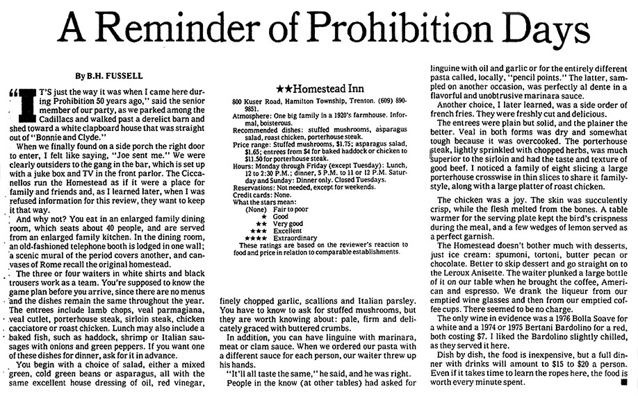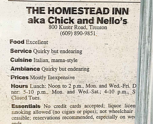 “Going to Chick and Nello’s Homestead Inn makes me wish I were Italian. Then, when a waiter in rough white shirt and black pants clomped over to recite the menu, I wouldn’t have to ask him to repeat it because I would know that food in my bones.